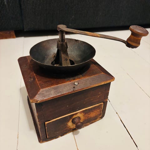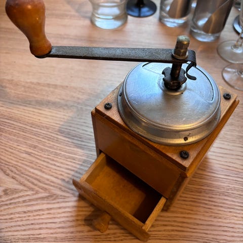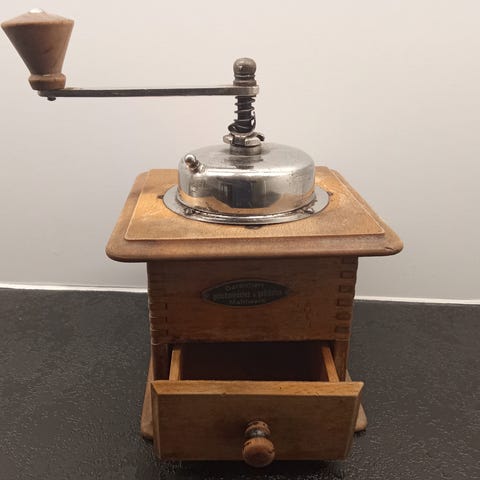 La Pavoni kahvimylly, jossa puinen runko ja metalliset osat. Kahvimyllyssä on käsikäyttöinen mekanismi, joka soveltuu kahvin jauhamiseen kotikäyttöön.