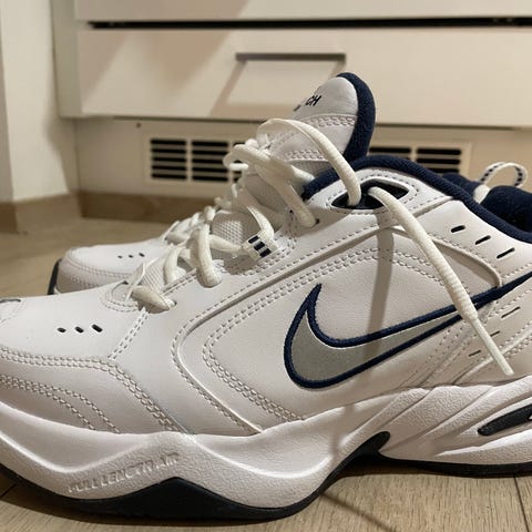 Nike Tennarit valkoisella nahkapäällisellä ja kumipohjalla. Kengät ovat koko 42 ja sopivat arkikäyttöön. Mallissa on perinteinen nauhakiinnitys ja Nike Air -merkintä kantapäässä. Kengät ovat käytetyt ja niissä näkyy käytön jälkiä pohjissa.