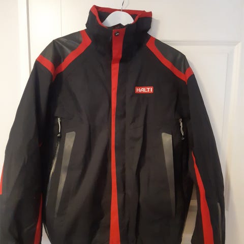 Kerran käytössä olleet takki ja housut. Takissa on huppu ja sivuilla vetoketjulliset taskut. Housuissa on myös sivuilla taskut.