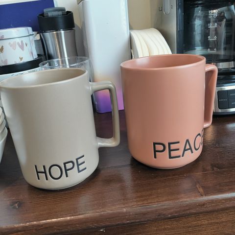 Myydään kaksi kahvimukia. Valkoinen kahvikuppi havainnollistamassa kuppien kokoa.