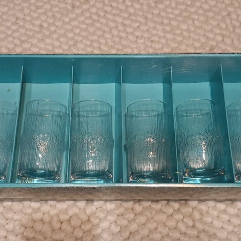 4 kpl laseja alkuperäisessä laatikossa styrox-täytteineen 60-l. Kannessa oma merkintä "olutlasi". Vain nouto ja käteismalsu