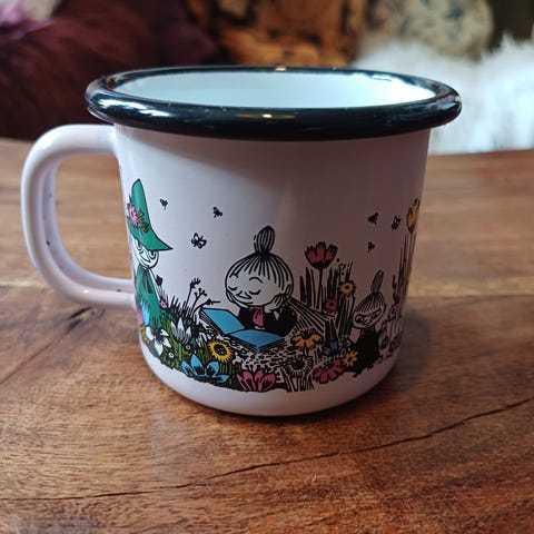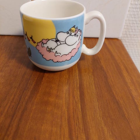 Emalinen Muumi muki, vaalean beige, korkeus 8 cm, halk. 9,5 cm.