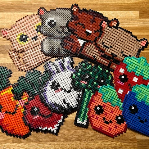 Meillä on paljon hamahelmikoristeita (eläimiä, satuhahmoja, avaruusaiheita, dinosauruksia, pääsiäis- tai joulukoristeita jne).