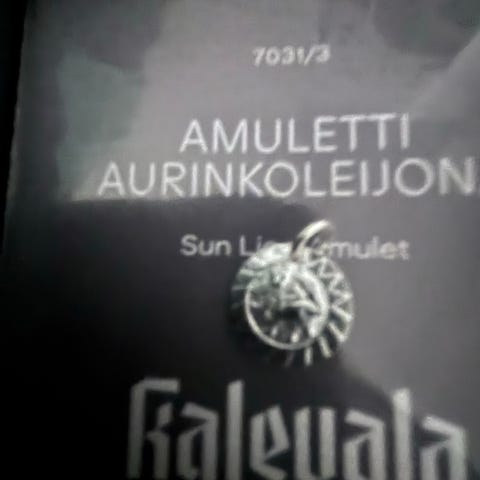 Hopeinen riipushela Amuletti-sarjaa isommassa koossa, halkaisija 16 mm. Lisa Simonsin Kalevala-korulle suunnittelema Hannunvaakuna-hela.