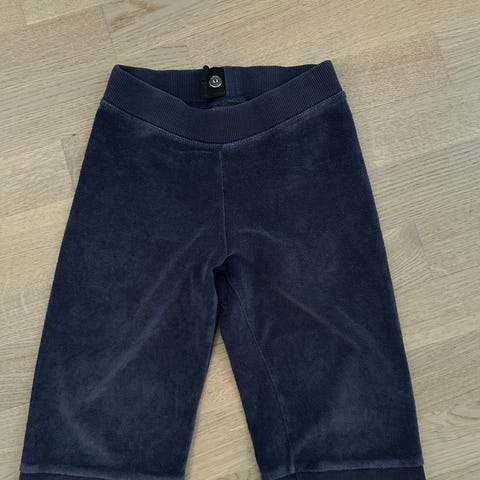 Siniset hyväkuntoiset trikoohousut, joissa säätökuminauha. Etutaskut ovat koristeena, takataskut oikeat. Materiaali 95 % puuvillaa, 5 % elastaania. Malli on aika kapea.