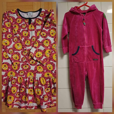 Pehmeä, hyvin pidetty veluuriasu koossa 104. Kuten kuvista näkyy sekä paita että housut ovat hyväkuntoiset ja värit kirkkaat.