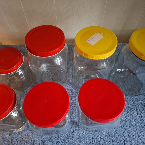 5kpl 3 litran lasitölkkejä säilöntään korissa.