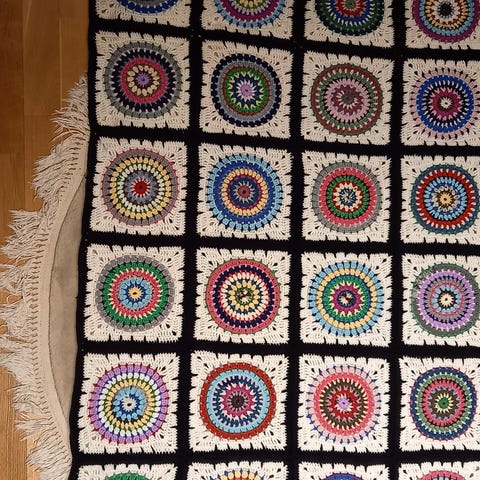 Käsin virkattu upea Mandala Madness torkkupeitto. Täysin käyttämätön. 75%villaa.
