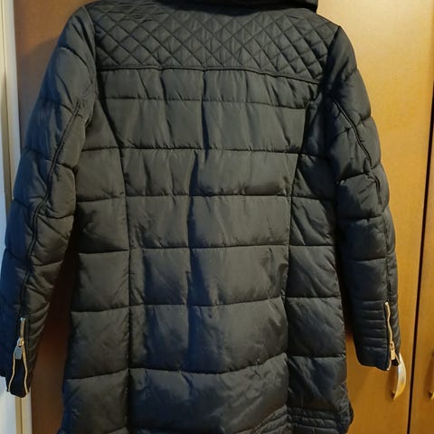Musta takki, koko merkintä 42, mutta käy hyvin pienempi kokoiselle, vetoketjulliset taskut, huppu, jossa kiristysnyöri ja vyötäröllä myös, taskujen seudussa hieman kulumajälkeä.