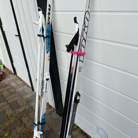 Kerran kaksi hiihdetyt, viime talvena ostetut sukset sekä sauvat. Rottefellan NNN siteet.