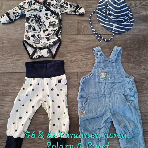 Vauvan vaatteet koossa 62. Pipo, housut, body. 3 paitaa. Merkkeinä mm. Lindex, Polarn O. Pyret.