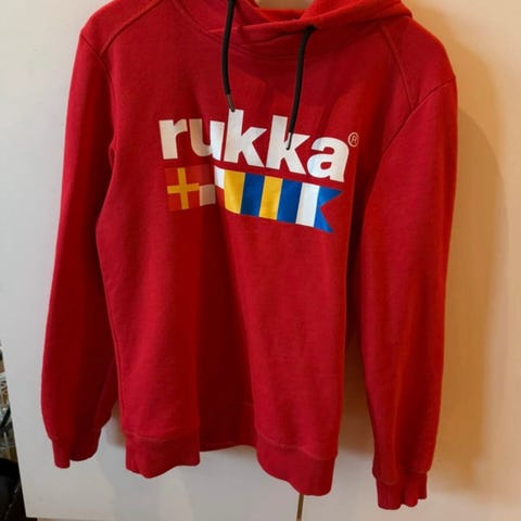 Rukkan keltainen huppari. Täysin ehjä. Väri vähän haalistunut ja pinnassa hieman nukkaa, mutta lähtee varmaankin nukanpoistajalla.