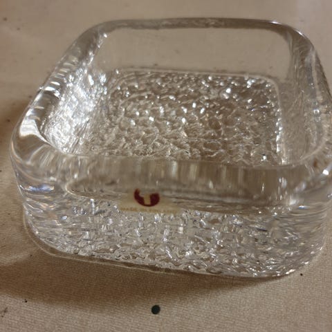 Timo Sarpanevan Iittalalle v. 1965 suunnittelema Riite kynttilänalusta / tuhkakuppi. Alusen halkaisija on 16 cm ja korkeus 4 cm. Myynnissä oleva alunen on ehjä ja muutenkin hyväkuntoinen.
