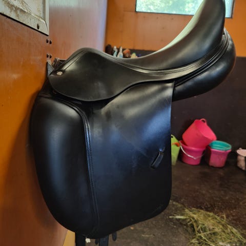 Toukokuussa 2025 uutena ostettu ja juuri topattu satula. Ollut eestinhevosella, jolla haastava selkä (melkein piti ostaa mittatilauksella). Ratsastaja myös pitkä ja pitkäjalkainen, joka tekee omat haasteet satulalle. Myyn, koska poni on parempi estesatulalla ja kisaamme vain satunnaisesti helppoja koululuokkia.