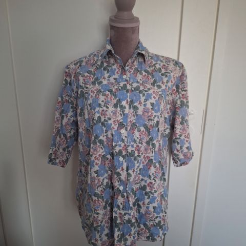 Koko 40, mutta paita on malliltaan väljä ja sopisi ehkä myös kokoa 42 käyttävälle. Tarkista mitat: rinnanympärys n. 106 cm, vyötärö n. 104 cm, hartiat n. 42 cm, hiha n. 61 cm, pituus niskasta helmaan n. 68 cm.