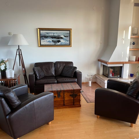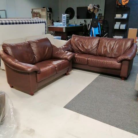 Nahkaverhoiltu sohvakalusto eli 3-istuttava sohva, 2 nojatuolia ja sohvapöytä