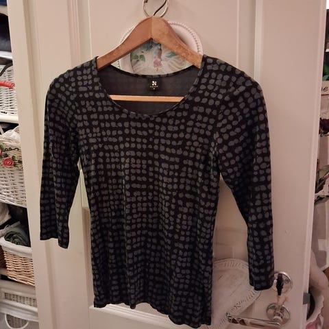 Myydään musta Nanson Allas-pusero ,koko S.Paksua puuvillaa 95 % ja 5 % elastaania.Kuvio beige/kullahtava.Nouto Naantalista tai postitus ToriDiilin Osta heti-palvelun kautta.