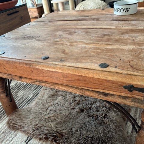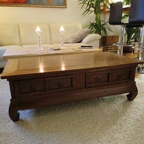 Kaunis ja tukeva akaasia puusta tehty täyspuinen olohuoneen sohväpöytä, ruskea kansi. Sivuilla kahvat. Sisältö ei kuulu kauppaan.
