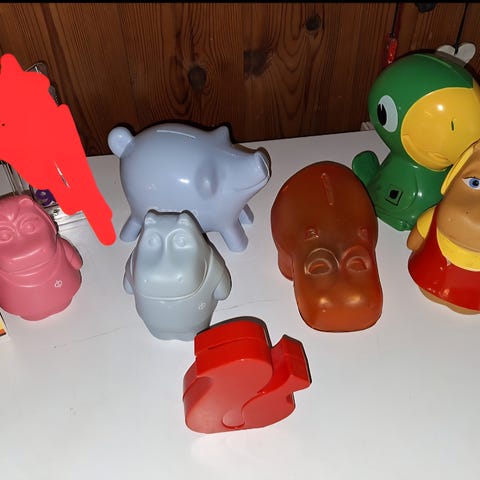 Osuuspankki, KOP, Postisäästöpankki, Uplandsbanken, HOP, Sampo sekä Hippo ja Panda säästölipas. Kaikki tavarat eivät ole virheettömiä, kun ovat käytettyjä tavaroita.