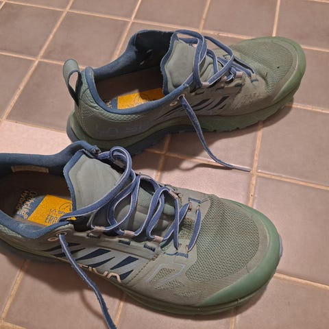 Hyvässä kunnossa olevat polkujuoksukengät kokoa 44,5. Kärjissä vähän naarmuja, muuten hyvässä kunnossa. Vähäisen käytön jälkeen todettu itselle liian pieniksi.