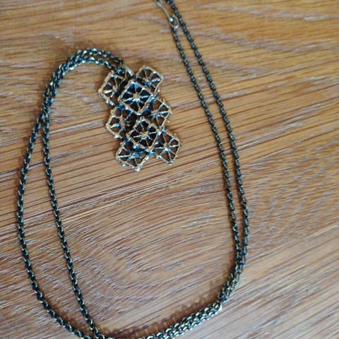 Pentti Sarpanevan suunnittelema kaulakoru, materiaalina pronssi ja kivi, riipuksen koko n. 3,5 x 8,0 cm, ketjun pituus n. 58,0 cm. Hinta 80 € tai tarjoa, Myydään tarjousten perusteella.