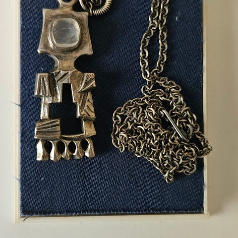 Pentti Sarpanevan suunnittelema kaulakoru, materiaalina pronssi ja kivi, riipuksen koko n. 3,5 x 8,0 cm, ketjun pituus n. 58,0 cm. Hinta 75 € tai tarjoa, Myydään tarjousten perusteella.