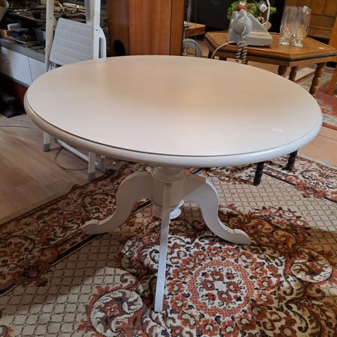 Pyöreä valkoinen retro sohvapöytä, pientä kulumaa reunoissa