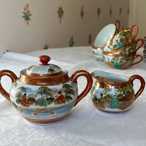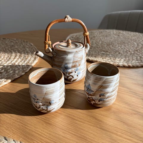 • Keraaminen teekannu (kullanvärinen kahva, koristeellinen kansinuppi)