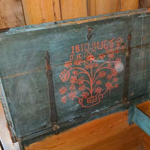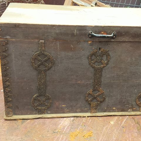 Kauniin sininen ajan patinoima kirstu. Kirstua on säilytetty aitassa, jossa on tod.näk. saanut kosteutta, koska "helmoissa" rautaosat hiukan ruosteessa.