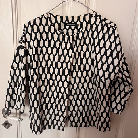 Myydään Marimekko jakku. Suunnittelija Samu-Jussi Koski. Koko 36. Kai-kai mitta 58 cm. Olka-helma 49 cm. Materiaali pellavasekoite( pellava 40%, viskoosi 55%, puuvilla 5%)