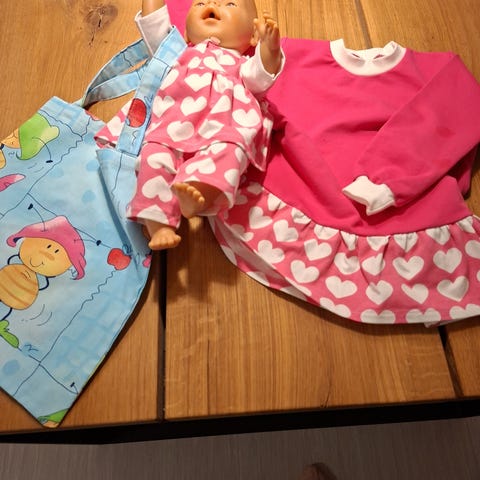Nukke (pituus 48cm) ja nukelle sopivia vaatteita sekä tarvikkeita ja kantokassi. Vaatteet ja tarvikkeet ovat erittäin siistejä ja kaikki on ehjiä. Nuken vaaleassa vartalossa on käytönjälkeä, mutta myös nukke on täysin ehjä.