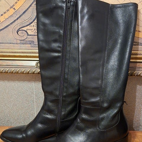 Huikeat Nahkasaappaat, nahkaa eikä muovia, mustat, kuviointia. Pari kappaletta.