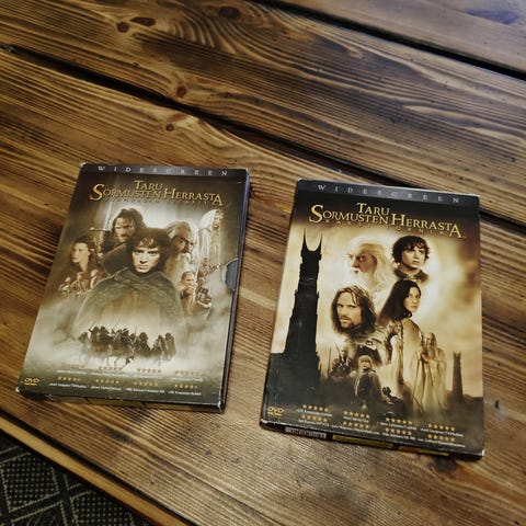 Myydään 3 kpl Taru sormusten herra DVD levyä. Sormusten ritarit, kaksi tornia, kuninkaan paluu. Hinta 5 e kpl tai kaikki yht 15 e. Kaikissa 2 Dvd:tä.