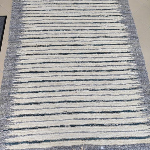 Käsinkudottu villamatto 96 x 61 cm, jossa loimena luonnonvalkoinen puuvillalanka ja kuteena luonnonvalkoinen mattovillalanka ja ruskea mattovillalanka, jossa 75% lampaanvillaa ja 25% ylämaankarjan karvaa. Ruskealla lehmällä otsatukka aitoa lehmänkarvaa, jonka saa halutessaan pois. Kantattu ruskealla matonkanttinauhalla. Mattoa voi käyttää molemmin puolin.