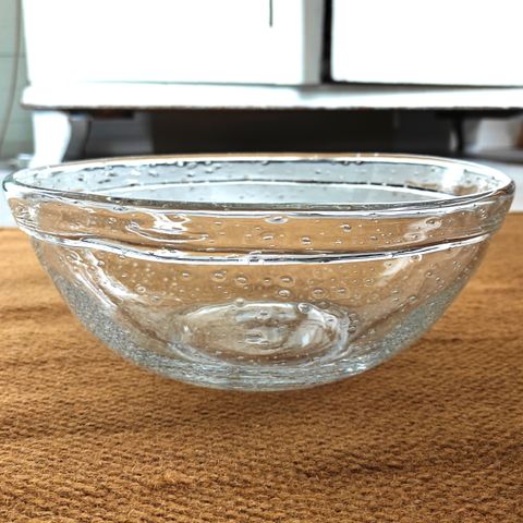 Oletettavasti Pentikin harmaa kuplalasia oleva tarjoilukulho. Pentikin tarra lähtenyt pesussa (jos sellainen on ollut), mutta pohjassa oleva ”käsinpesu” tarta vielä paikoillaan. Vain todella pieniä naarmuja löysin jos oikeen tarkasti katsomalla katsoo ja etsii. Muuten täytin ehjä ja hyvässä kunnossa oleva kulho. Ei säröjä (yksikään kupla ei ole puhjennut). :)