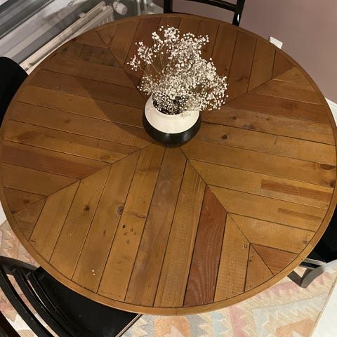Noin 3 vuotta vanha mangopuusta valmistettu ruokapöytä. Leveys 120cm. Pientä käytönjälkeä löytyy, yksi näkyvämpi lommo joka näkyy vikassa kuvassa. Huomioitu hinnassa. Todella tukeva.