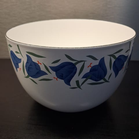 FINEL iso Kehäkukka kulho, 3 litraa. Korkeus n. 14 cm ja suun halkaisija 21 cm. Malli Kaj Franck, koriste Esteri Tomula. Materiaali panssariemaloitu teräs. Valmistettu 60-70 -luvuilla.