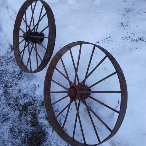 Hyväkuntoiset Upeat Vanhat ja Isot kärrynpyörät myydään , 2kpl, puu/ metalli, halkaisija n. 115 cm, vain nouto koska painavat.