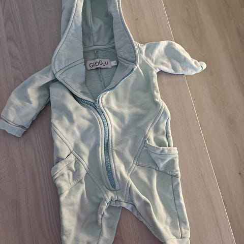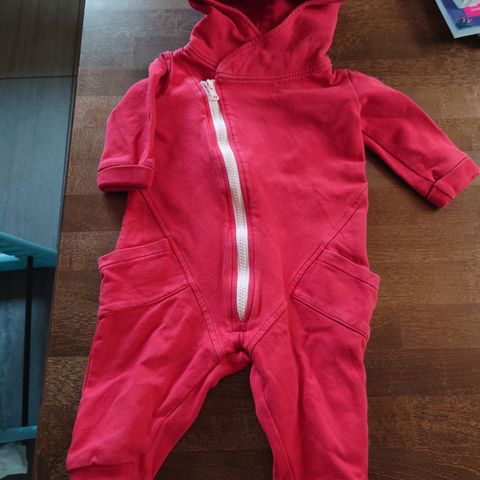 Gugguun beigen värinen jumpsuit kokoa 68cm, mutta vastaa mielestäni 62cm/68cm kokoa. Vaaleanpunainen vetoketju. Ehjä ja muuten oikein siisti, mutta edessä sivussa haaleaa ruokatahraa, en ole koittanut poistaa, kun huomasin vasta kuvatessa.
