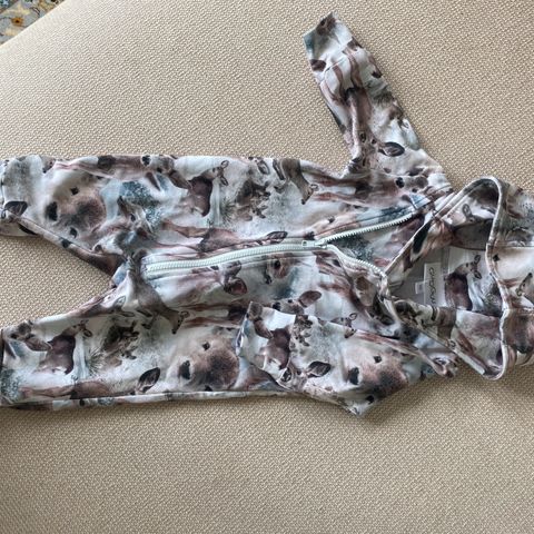 Gugguun beigen värinen jumpsuit kokoa 68cm, mutta vastaa mielestäni 62cm/68cm kokoa. Ehjä ja muuten oikein siisti, mutta edessä sivussa haaleaa ruokatahraa, en ole koittanut poistaa kun huomasin vasta kuvatessa.