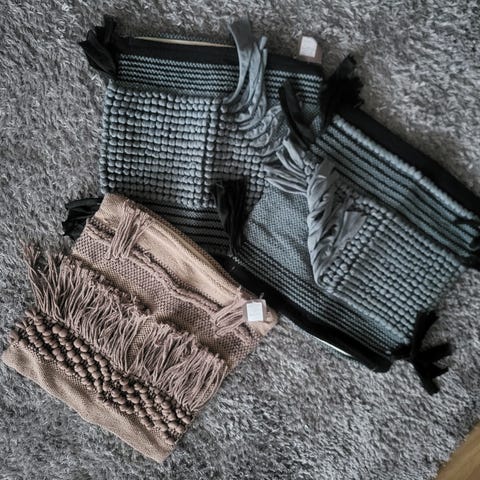3 kpl koristetyynyjä ja torkkupeitto. Ainoastaan hetken aikaa ollut käytössä, ei kulumaa tai rispaumia.