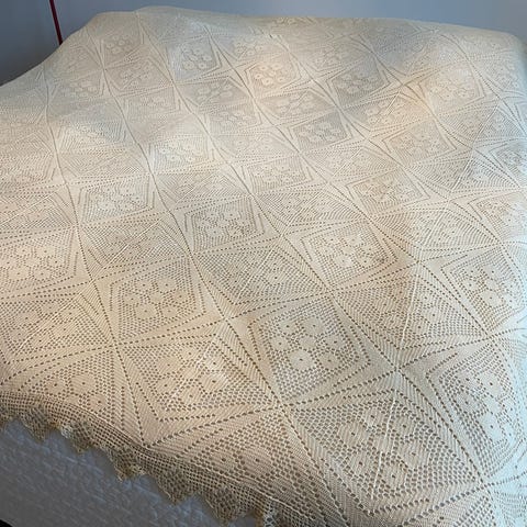 Myydään kuvanmukainen vaalea mummon virkkaama pitsinen päiväpeitto tarpeettomana. Koko noin 200x200 cm.