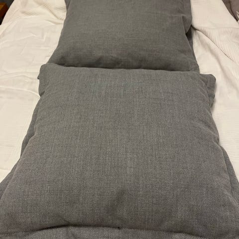 Isot selkänojatyynyt esim. sängylle. Päälliset pesty. Pinnassq pientä nyplyä ja yhden tyynyn takana muutama läikkä. Vielä muhkeat ja käyttökelpoiset. Ostettu Jyskistä. Mitat otettu muhkeasta tyynystä.