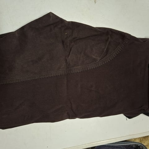 Väri suklaanruskea, materiaali joustava puuvilla/ polyamidi/ elastaan kangas. Housuissa on kokopitkät tekomokkapaikat. Housut erittäin hyvässä kunnossa, vain muutamia pieniä tahroja jäänyt paikkoihin (näkyy kuvissa.)