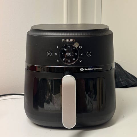 Philips Airfryer, musta väri, muovinen runko. Käytetään ruoan paistamiseen tai lämmittämiseen ilman öljyä/rasvaa, soveltuu kotitalouskäyttöön.