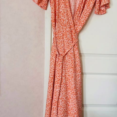 Vain kerran pidetty kietaisumekko, mustavalkoinen, hillitty kukkakuvio. Pituus noin puoleen sääreen n. 170 cm käyttäjällä. Hiha peittää olkapään.
