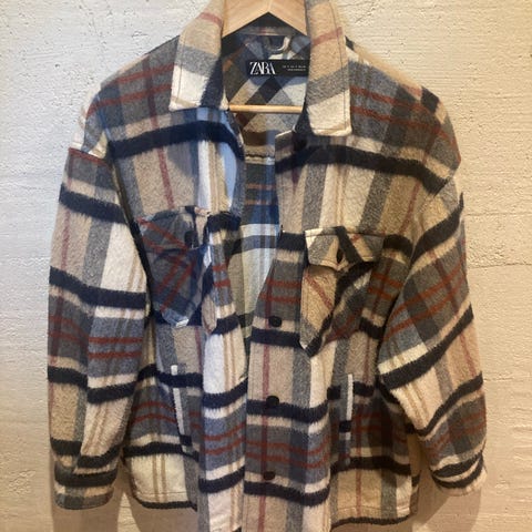 Zara Muu takki naisten koko S, kirjavassa värissä. Takki on valmistettu pehmeästä ja lämpimästä materiaalista, jossa on ruutukuviointi. Takissa on pitkähihaiset hihat ja napilliset hihansuut. Sopii viileämpiin säihin käytettäväksi.