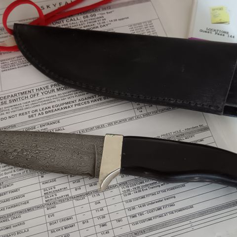 1. SKYFALL: Kincaden veitsi - Upea veitsi damascus-terällä ja puhvelinsarvesta tehdyllä kahvalla. Nahkainen tuppi kuuluu tietysti mukaan,