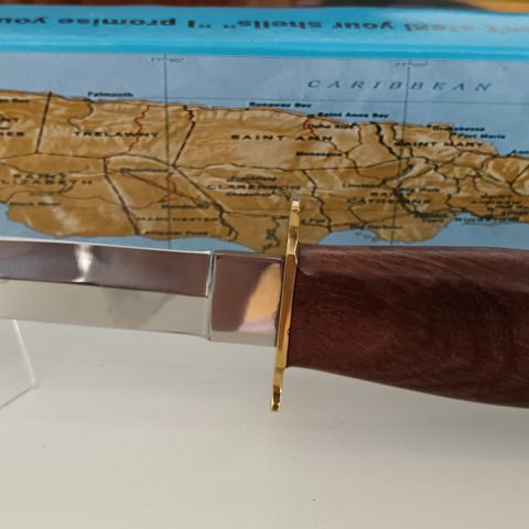 Tarkka kopio tiikkikahvalla ja näyttävällä, pitkällä 38,5cm olemuksellaan. Ja on jämäkkä, painava veitsi.