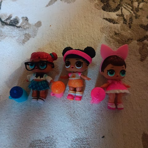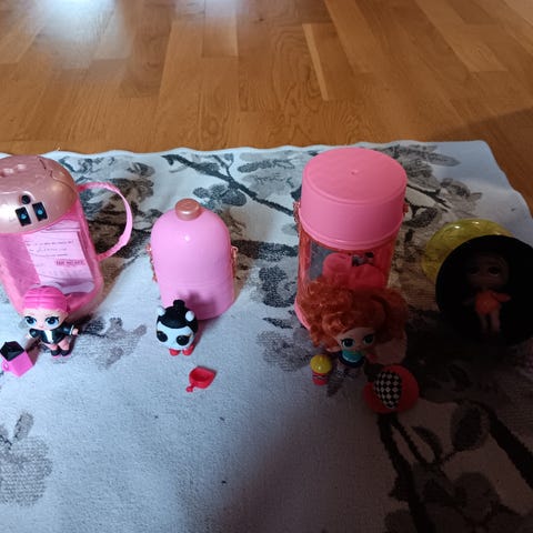 L.O.L. suprise seitsemän hahmoa yksi eläin yksi isompi hahmo ja viisi pienenmpää hahmoa 60 euroa kaikki ja Iso pallo 12 euroa ja pieni 8 euroa